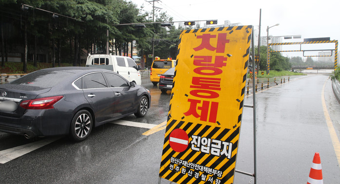 밤사이 내린 장맛비로 29일 오전 전북 전주시 완산구 서신동 마전교의 언더패스(반지하도)가 통제돼 있다.