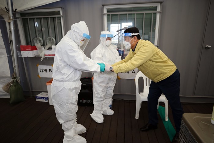 이승로 성북구청장이 지난 1~2일 구 보건소와 서울시 민방위교육장, 구청 바람마당에 설치된 선별진료소와 선별검사소를 방문해 의료진과 지원 관계자에 감사의 인사를 전했다. 사진은 이 구청장(오른쪽)이 의료진에게 감사 인사를 전하는 모습. (사진제공=성북구청)