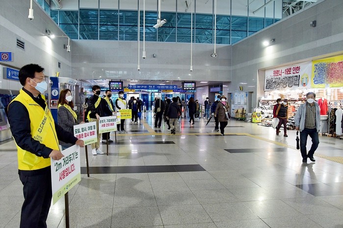 경기 의정부시 호원2동행정복지센터가 최근 코로나19 확산 방지를 위한 '사회적 거리두기 캠페인'을 펼쳤다. 이날 직원들은 회룡역에서 2m 간격유지 홍보피켓과 손 세정제 등 홍보물품 자율 배부대를 활용하는 방식으로 캠페인을 진행했다. 사진은 캠페인 전개 모습. (사진제공=의정부시청)