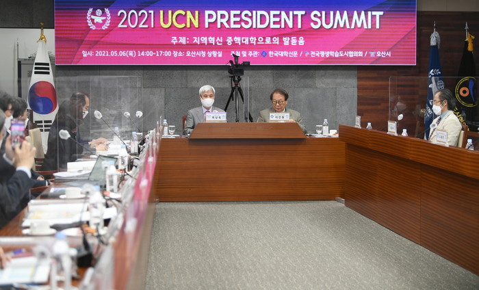 전국평생학습도시협의회장을 역임하고 있는 곽상욱 경기 오산시장이 6일 '2021 전문대 UCN 프레지던트 서밋' 제3차 컨퍼런스에서 '평생학습과 대학연계를 통한 지역사회 일자리창출 방안'을 주제로 강연했다. 사진은 컨퍼런스에 참석한 곽 시장(가운데 왼쪽)이 강연을 하고 있는 모습. (사진제공=오산시청)