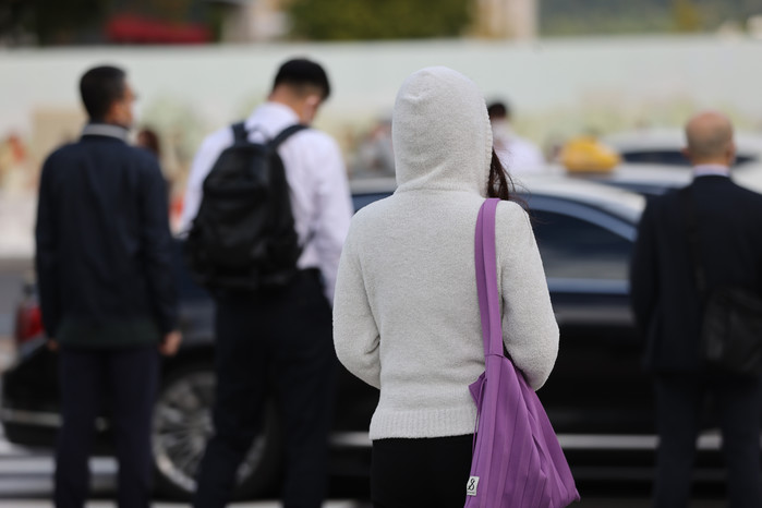 쌀쌀한 날씨를 보인 12일 오전 서울 종로구 광화문네거리에서 후드가디건 모자를 눌러쓴 한 시민이 발걸음을 옮기고 있다.