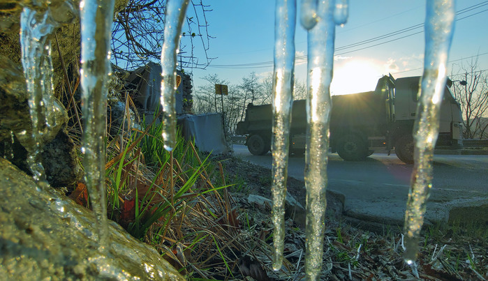 꽃샘추위가 기승을 부린 22일 아침 강원 강릉과 평창을 연결하는 대관령 도로변에 고드름이 달려 있다.