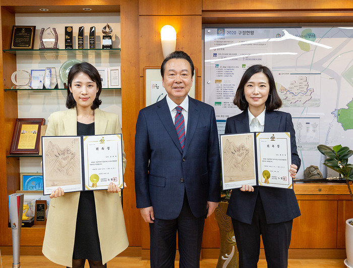 노현송 서울 강서구청장은 21일 구청장실에서 올해 창단한 강서구립소년소녀합창단의 초대 지휘자로 황주연씨를, 반주자로 김태희씨를 위촉했다. 사진은 위촉식에서 노 구청장(가운데)이 초대 지휘자로 위촉된 황씨(오른쪽), 반주자 김씨와 기념촬영을 하고 있는 모습. (사진제공=강서구청)