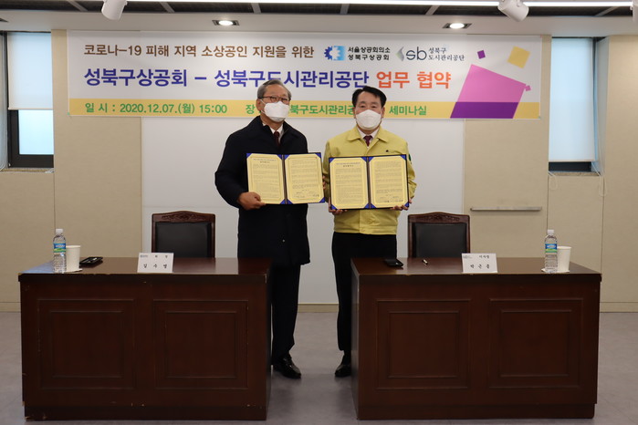 서울 성북구도시관리공단이 지난 7일 성북구상공회와 코로나19 피해 소상공인 지원 및 지역경제 활성화를 위한 업무협약을 체결했다. 이 협약을 통해 지역 소상공인들을 돕기 위해 공단 기구축 인프라를 구민과 소상공인의 경제 플랫폼으로 활용하게 된다. 사진은 협약식에서 박근종 이사장과 김수영 회장이 기념촬영을 하고 있는 모습. (사진제공=성북구도시관리공단)
