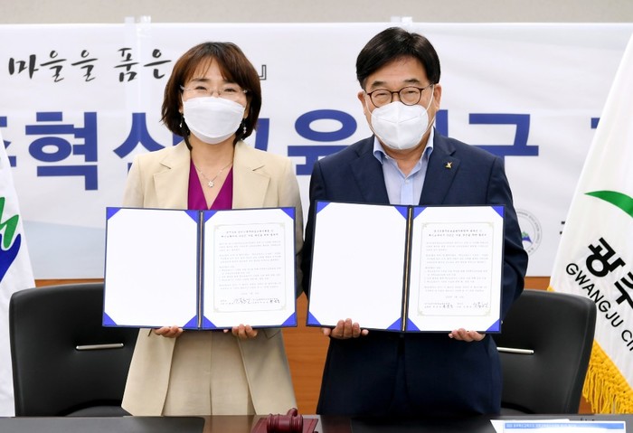 경기 광주시가 9일 광주하남교육지원청과 올해부터 오는 2026년까지 혁신교육지구 시즌Ⅲ를 추진하기 위한 업무협약을 체결했다. 이번 협약은 지역 거버넌스를 통한 교육자치 실현, 학교와 마을의 협력을 통한 혁신교육생태계 강화 등 '학교와 마을이 함께하는 광주형 혁신교육' 실현을 목표로 한다. 사진은 협약 체결 후 신동헌 시장(오른쪽)이 한정숙 교육장과 기념촬영을 하는 모습. (사진제공=광주시청)
