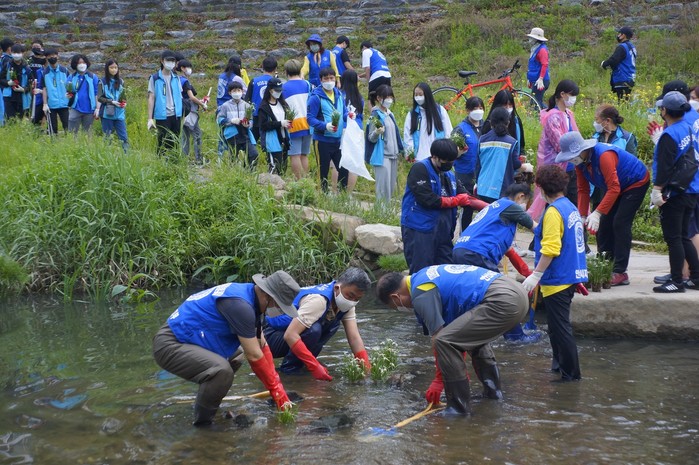 경기 안산시는 최근 (사)바다살리기국민운동본부 안산시지부와 함께 ‘우리 동네 하천 구조대! 생태 하천 안산천 살리기’ 일환으로 안산천 수생식물 식재 조성, 수질 관찰 등과 함께 환경정화 활동을 펼쳤다. 사진은 이날 참여한 시민들이 안산천에 수생식물 식재를 하고 있는 모습. (사진제공=안산시청)