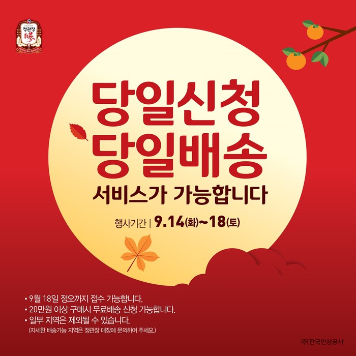 '당일신청·당일배송' 서비스는 결제 즉시 가까운 정관장 매장에서 직접 실시간으로 배송되며 20만원 이상 구매한 고객에게는 무료로 제공된다.
