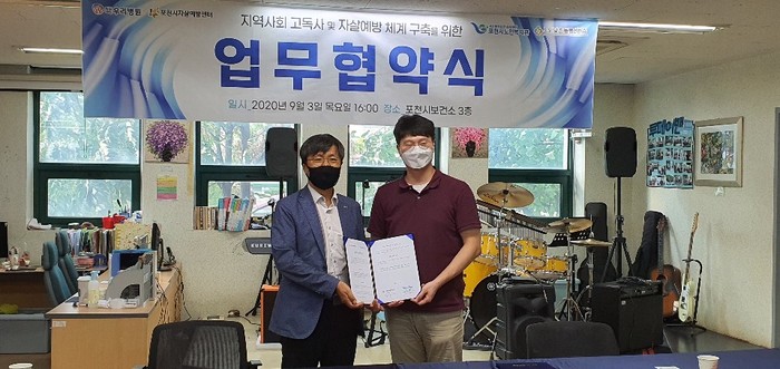 경기 포천시 노인복지관이 사회적 고립과 우울 위험이 높은 노인의 고독사 및 자살 예방을 위한 서비스 지원을 위해 시 자살예방센터와 최근 업무협약을 체결했다. 사진은 양 기관 관계자들이 협약을 맺은 후 기념촬영을 하는 모습. (사진제공=포천시청)