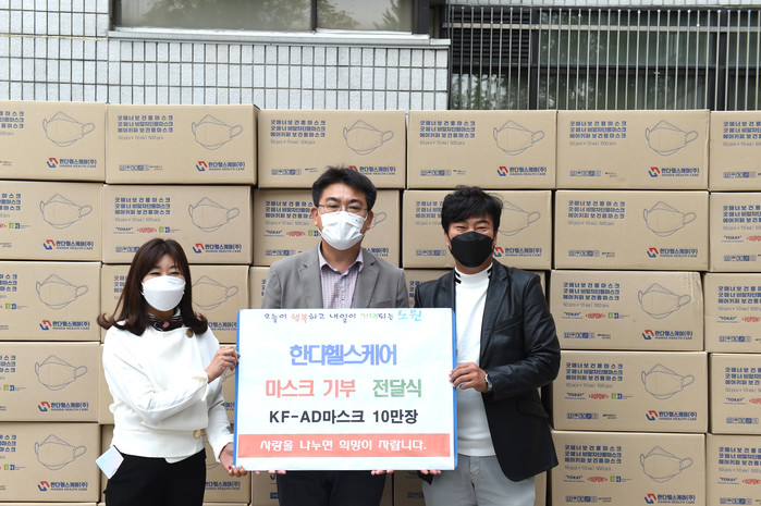 서울 노원구는 21일 (주)한다헬스케어로부터 코로나19 예방을 위한 마스크(KF-AD마스크 10만장·5000만원 상당)를 전달받았다. 사진은 전달식에서 오승록 구청장(가운데)과 관계자들이 기념촬영을 하는 모습. (사진제공=노원구청)