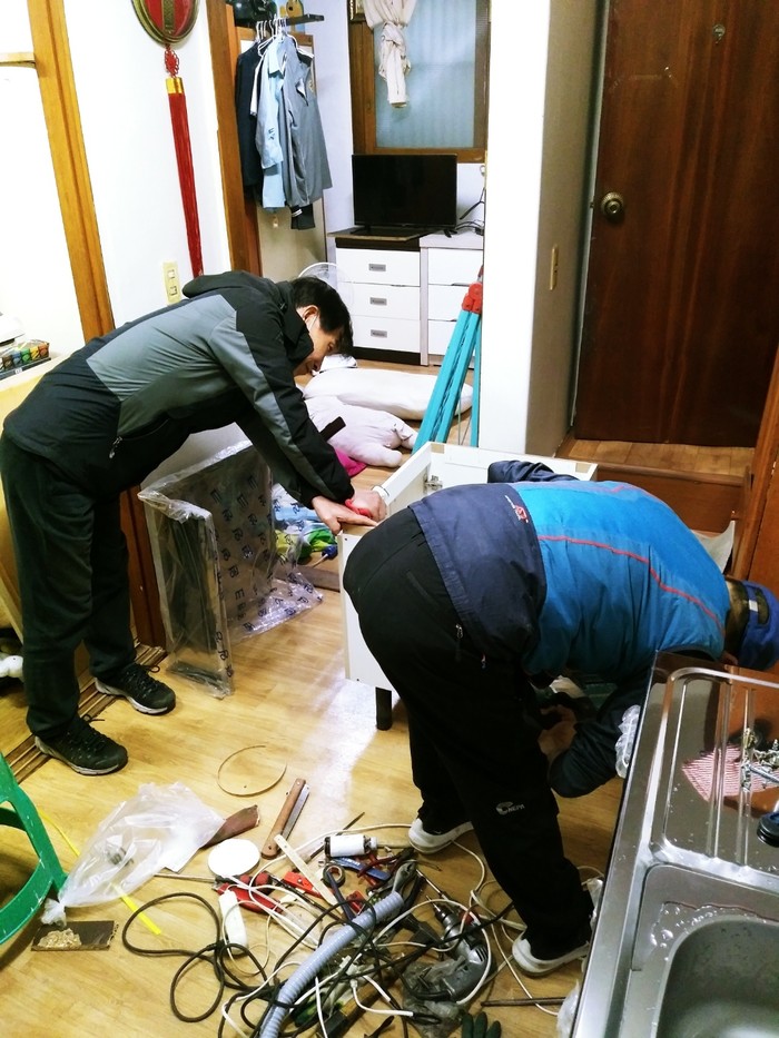 서울 중랑구 면목본동은 주거환경 개선이 필요한 저소득층 두 가구를 선정해 지난 8~9일 양일간 집수리를 진행했다. 선정된 두 가구는 모두 중고생이 있는 저소득층 한부모 가구로 평소 주거환경의 어려움을 호소해 왔다. 사진은 집수리 봉사단이 싱크대를 조립하고 있는 모습. (사진제공=중랑구청)