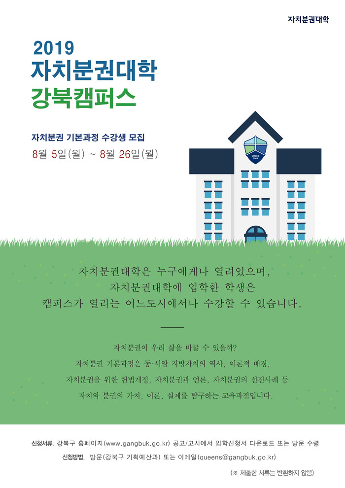 [시민일보 = 홍덕표 기자] 서울 강북구(구청장 박겸수)가 지역 주민들의 자치분권에 대한 이해증진 및 역량 강화를 위해 '자치분권대학 강북캠퍼스'를 개설하고 오는 26일까지 수강생을 모집한다.