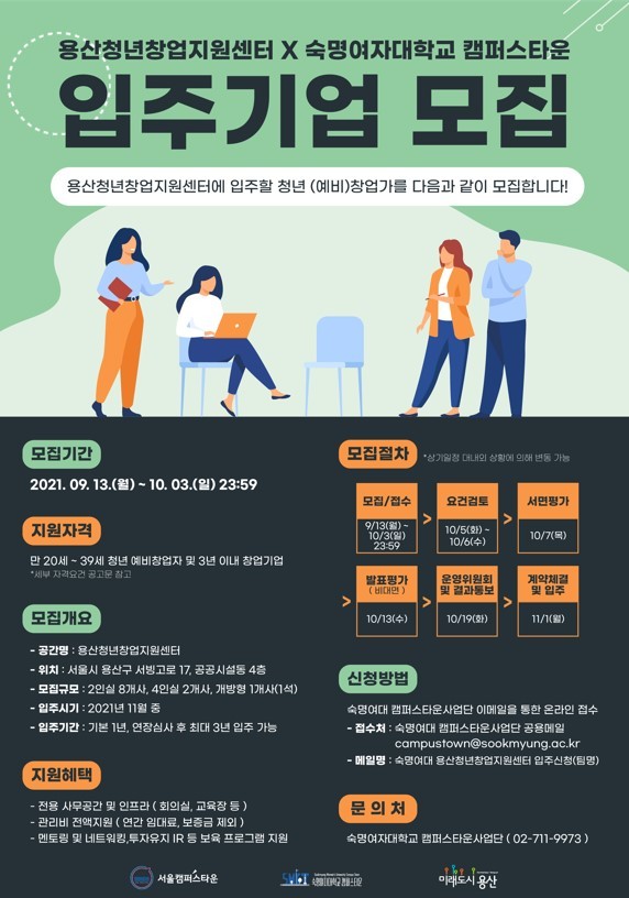 입주를 희망하는 기업은 입주승인 신청서, 사업계획서 등을 작성해 숙명여자대학교 캠퍼스타운사업단(이하 사업단) 이메일로 접수하면 된다.
