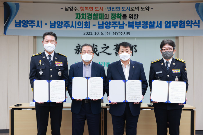경기 남양주시가 6일 남양주시의회 및 남양주남·북부경찰서와 자치경찰제 정착을 위한 업무협약을 체결했다. 이번 협약은 지방경찰제가 전면 시행되면서 자치경찰제의 조기 정착과 기관 간 협력을 강화하기 위해 마련됐다. 사진은 협약식에서 조광한 시장(왼쪽 두 번째)과 관계자들이 기념촬영을 하고 있는 모습. (사진제공=남양주시청)