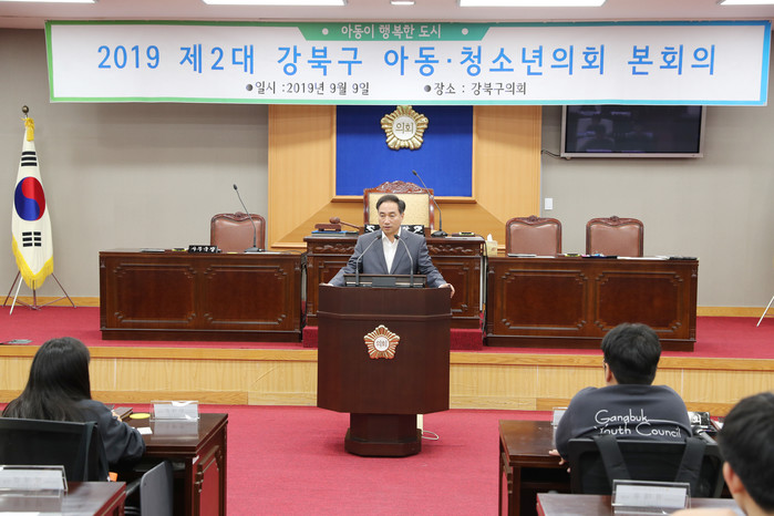 [시민일보 = 홍덕표 기자] 이백균 서울 강북구의회 의장이 최근 구의희 본회의장에서 열린 '2019 강북구 아동·청소년의회' 본회의에 참석해 아동·청소년 의원들을 격려했다.