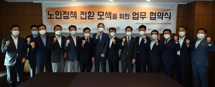 성북구는 최근 전국 2개 시·도 및 10개 시·군·구 등과 '노인정책 전환 모색을 위한 업무 협약(MOU)'을 체결했다. 협약의 주요 내용으로는 노인정책 전환을 위한 협력관계 구축 등이 포함돼 있다. 사진은 이승로 구청장(왼쪽 세 번째)과 단체장들이 기념촬영을 하고 있는 모습. (사진제공=성북구청)
