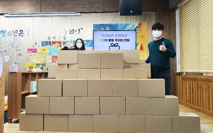 서울 서대문구 청소년활동공간 꿈다락이 코로나19로 인한 외부활동 제한으로 지쳐있을 지역내 청소년 40명에게 손 세정제, 비타민, 식료품, 손편지 등으로 구성한 응원 꾸러미를 최근 전달했다. 사진은 꾸러미를 포장한 후 직원들이 기념촬영하는 모습. (사진제공=서대문구청)
