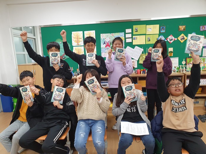 전남 순천 외서초등학교 학생들이 최근 졸업장 수여식에서 직접 출간한 동화책 <유적을 지켜라! 월평탐사대2>를 발표했다. <유적을 지켜라! 월평탐사대2>는 외서초등학교 5~6학년 학생들이 지난 1년 동안 학교 인근 외서면 월평리에 있는 국가사적 제458호 월평 구석기 유적지를 배경으로 창작한 동화책이다. 사진은 학생들이 책을 들고 기념촬영을 하는 모습. (사진제공=외서초등학교)