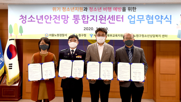 서울 노원구가 19일 노원경찰서, 서울시북부교육지원청, 노원구청소년상담복지센터와 위기 청소년 지원과 청소년 비행 예방을 위한 '청소년안전망 통합지원센터 구축 및 위기청소년 통합지원' 업무협약을 체결했다. 사진은 오승록 구청장(오른쪽 두 번째)이 협약기관 관계자들과 기념촬영을 하는 모습. (사진제공=노원구청)
