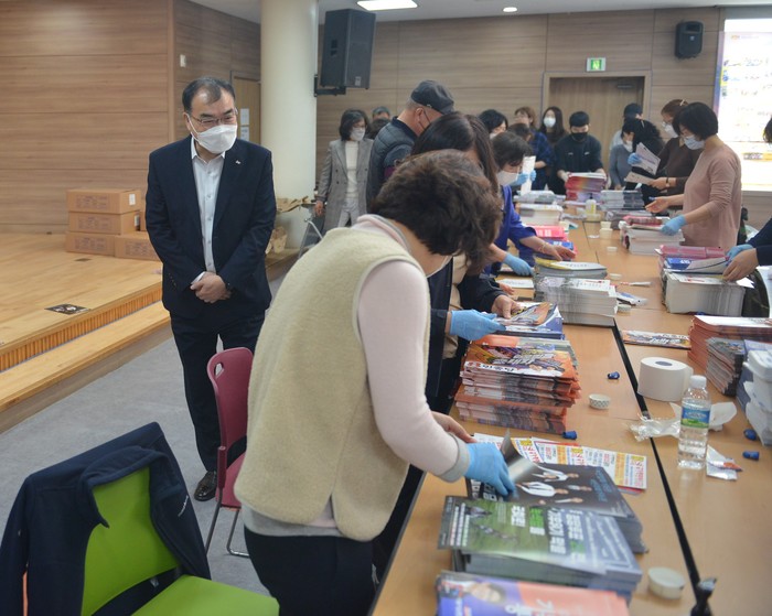 송영완 경기 수원시 영통구청장은 지난 4일 동 행정복지센터를 찾아 제21대 국회의원 선거준비 및 코로나19 대응에 노고가 많은 직원들을 격려했다. 사진은 송 구청장(왼쪽)이 일하는 직원들을 바라보는 모습. (사진제공=영통구청)