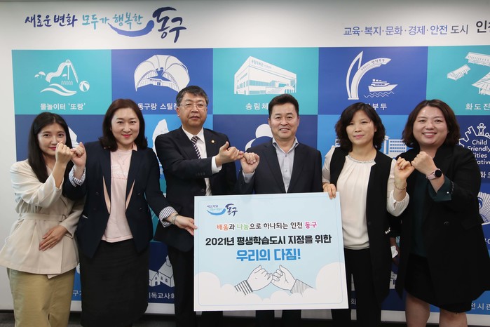 인천 동구가 19일 허인환 구청장과 구 관계자들이 자리한 가운데 '2021년 평생학습도시 지정'을 위한 결의대회를 열고 지역 평생학습 활성화를 위해 최선의 노력을 다할 것을 다짐했다. 사진은 허 구청장(오른쪽 세 번째)과 관계자들이 기념촬영을 하는 모습. (사진제공=인천동구청)