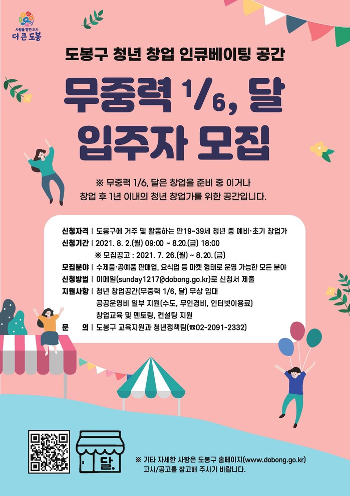 [시민일보 = 여영준 기자] 서울 도봉구(구청장 이동진)는 창업 인큐베이팅 공간 '무중력 1/6, 달'의 새로운 사업주를 모집한다고 17일 밝혔다.