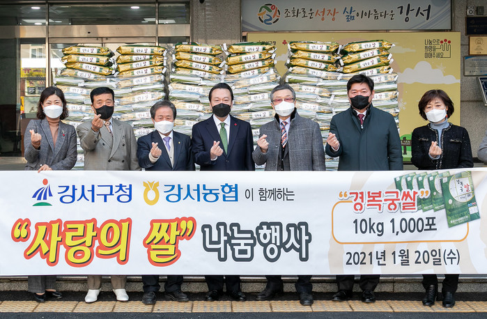 강서구는 20일 강서농업협동조합으로부터 10kg 쌀 1000포를 전달받았다. 구는 기탁받은 쌀을 서울사회복지공동모금회를 통해 지역내 홀몸노인과 한부모가정 등 이웃에게 전달할 예정이다. 사진은 전달식에서 노현송 구청장(가운데)과 관계자들이 기념촬영을 하는 모습. (사진제공=강서구청)