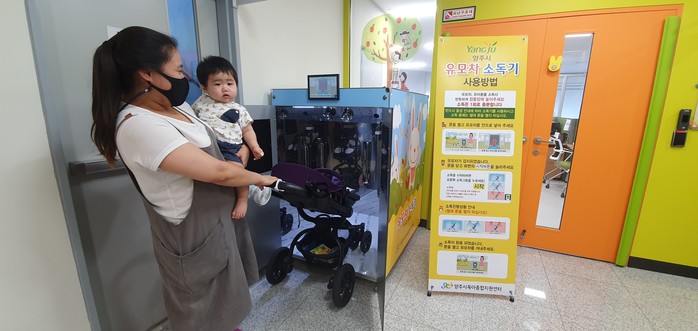 경기 양주시육아종합지원센터가 최근 상대적으로 면역력이 낮은 영유아의 건강 보호와 코로나19 감염 예방을 위해 센터 내 유모차 소독기(살균기)를 설치하고 운영을 시작했다. 사진은 센터를 방문한 시민이 유모차 소독기를 사용하는 모습. (사진제공=양주시청)