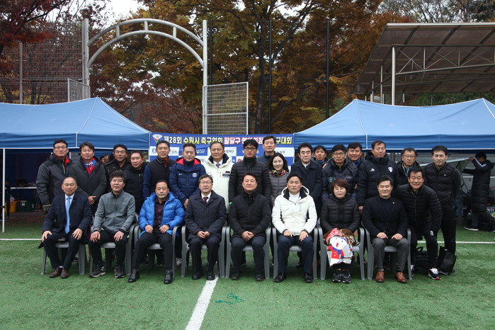 지난 17일 경기 수원시 팔달구에 소재한 수원월드컵경기장 인조잔디 1·2구장에서 열린 ‘제28회 수원시 팔달구 축구연합회장기 축구대회’가 성공리에 마무리됐다. 사진은 이훈성 구청장 및 관계자들이 기념촬영을 하는 모습. (사진제공=팔달구청)