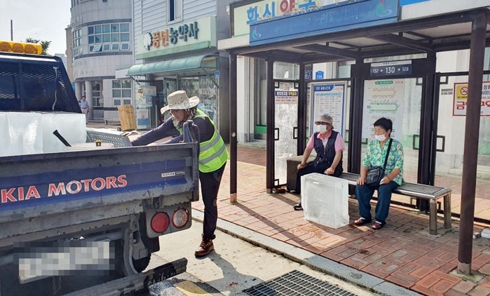 섭씨 30도를 웃도는 무더운 날씨를 보인 19일 충남 서천군 장항읍 신창리 시내버스 승강장에 얼음이 비치돼 있다. 서천군은 계속되는 폭염에 시내버스 이용객이 잠시나마 무더위를 식힐 수 있도록 지난 15일부터 낮 시간대 지역 13개 시내버스 승강장에 얼음을 비치했다.