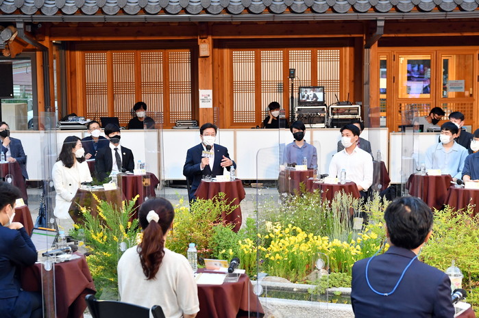 경기 수원시는 7일 행궁동 화홍사랑채에서 ‘2030 소통 프리토킹 두 번째 이야기’를 열었다. 이날 프리토킹에 참여한 청년들은 정부 정책에 대한 생각 및 사회 이슈를 주제로 의견을 제시했다. 사진은 염태영 시장(가운데)이 청년들과 대화를 나누고 있는 모습. (사진제공=수원시청)