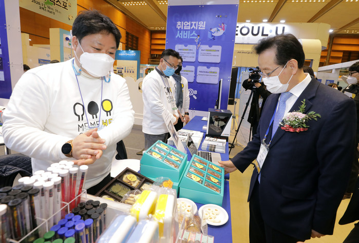 정순균 서울 강남구청장은 11일 코엑스에서 열린 ‘2020 대한민국 일자리 엑스포’에 참석했다. 구는 전액 구비로 지원 중인 중소기업 청년인턴십 사업 등을 온·오프라인으로 소개하고 강남 스타트업센터와 스타일 브랜드(MEMEWE Gangnam)을 홍보했다. 사진은 정 구청장이 일자리 엑스포 현장을 둘러보고 있는 모습. (사진제공=강남구청)