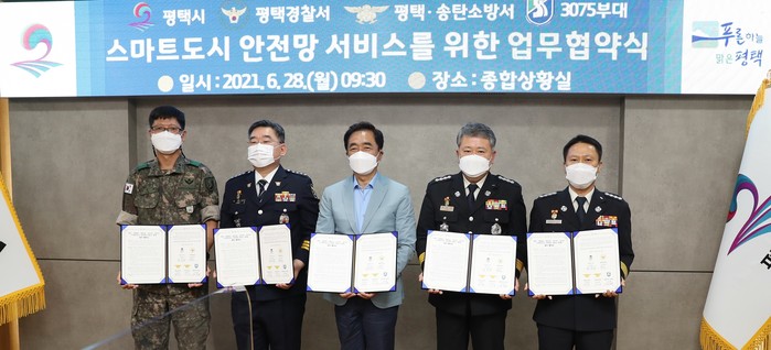 [평택=오왕석 기자] 평택시(시장 정장선)는 ‘스마트시티 통합플랫폼 기반구축사업’ 완료에 따라 28일 스마트도시 안전망 서비스 제공을 위해 평택시, 평택경찰서, 평택소방서, 송탄소방서, 3075부대 등 5개 공공기관이 참여한 가운데 완료보고회 및 협약식을 개최했다.