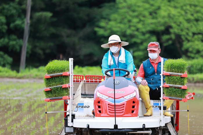 조광한 경기 남양주시장은 지난 18일 조안면 시우리에서 풍년을 기원하는 모내기 시연 행사에 참여해 시의 대표적인 품종으로 자리잡아 가고 있는 참드림(경기5호) 품종을 모내기하며 친환경 재배법을 소개했다. 사진은 이날 조 시장(왼쪽)이 승용이앙기를 이용해 모내기 작업을 하고 있는 모습. (사진제공=남양주시청)