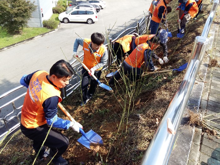 경기 양주시 자원봉사센터는 최근 시민참여 환경살리기 프로젝트의 일환으로 정우금속봉사단 등이 참여한 가운데 남면산업단지내 정우금속공업 일원의 주요 도로변 울타리 300여m에 넝쿨장미 묘목 150주를 식재했다. 사진은 묘목을 심는 모습. (사진제공=양주시청)