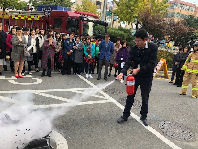 경기 수원시 권선구 세류3동 행정복지센터는 6일 동 청사 화재 발생시 대응능력을 강화하기 위해 직원 및 민원인, 주민자치센터 프로그램 수강생 등 40여명이 참여한 가운데, 매산119안전센터와 함께 '2019 소방합동훈련'을 실시했다. 사진은 참여자들이 소화기로 화재 진압 훈련을 하고 있는 모습. (사진제공=권선구청)