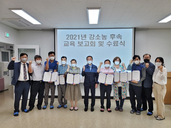이날 수료식에서 이지현 농업기술센터소장은 교육생들에게 수료증을 전달하고 인사말을 통해 “금년도 강소농 수료생들은 소수 인원이지만 교육기간 동안 상당히 열의가 높았고 농가별 작목과 특성이 다양하지만 특색있고 차별화 된 농업방향을 추구하고 있는 농가로 이번 강소농 교육을 통해 한층 더 성장하는 기회가 되었을 것으로 생각한다”고 말하고 앞으로 지역농업에 새로운 활력을 불어넣는데 기여해 줄 것을 당부했다.