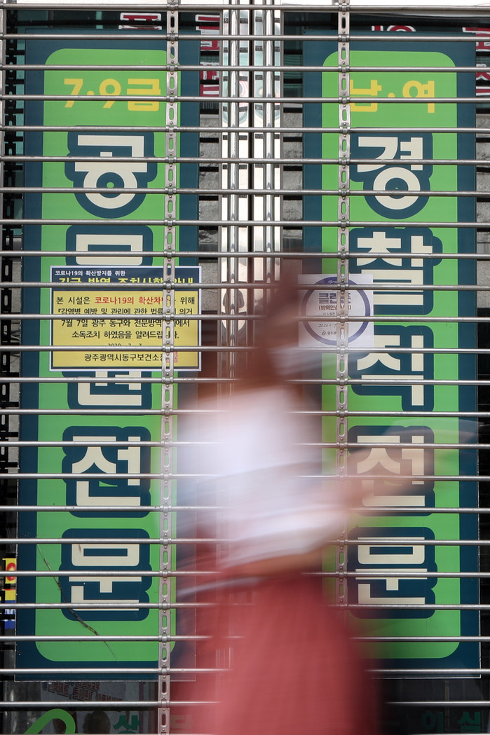 8일 오전 광주 동구 대의동 광주고시학원이 입주한 건물 입구에 코로나19로 인한 시설폐쇄 행정명령 처분서가 붙어 있다. 이 학원 수강생 사이에서는 코로나19 확진자 다수가 잇따라 나왔다.