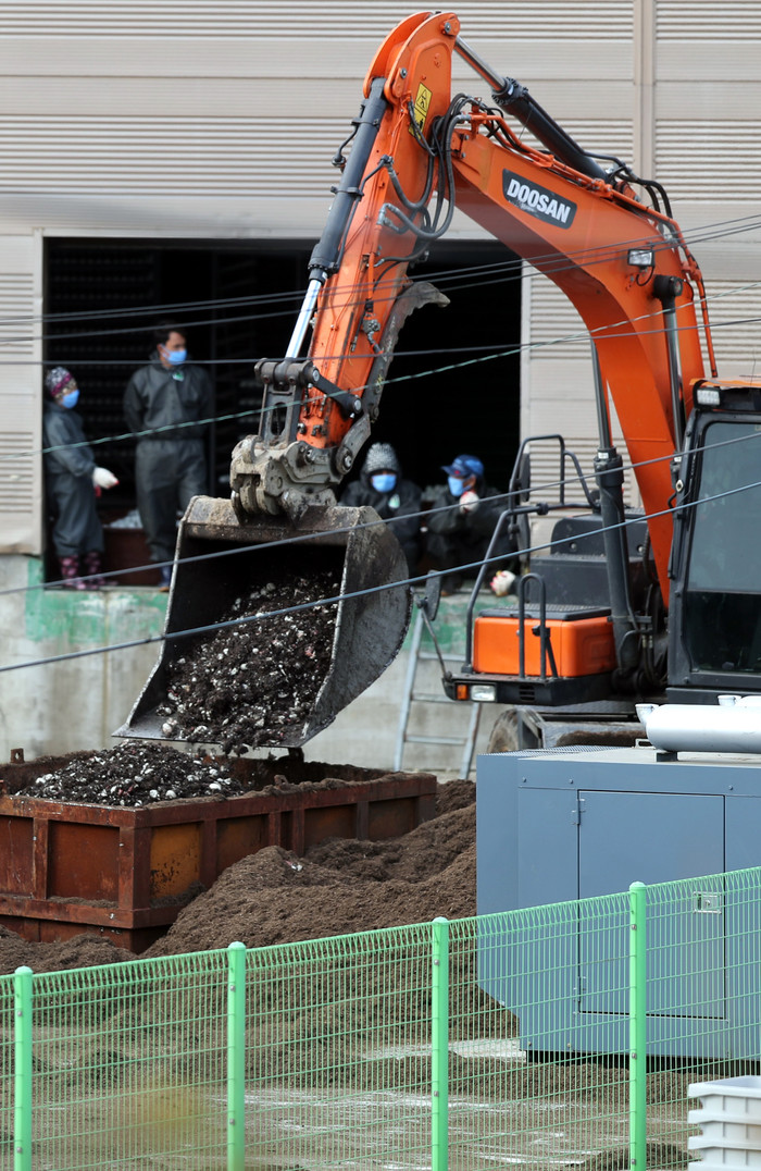 29일 고병원성 조류인플루엔자(AI)가 발병한 육용 오리 농가와 인접한 전북 정읍시의 한 산란계 농장에서 방역 당국이 달걀을 살처분하고 있다.