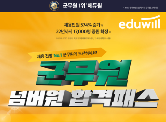 [시민일보 = 여영준 기자] 종합교육기업 에듀윌(대표 박명규)이 군무원 전용 커리큘럼으로 구성한 ‘넘버원 합격패스’ 과정을 선보인다.