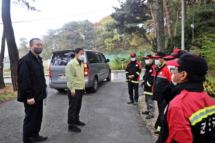 서경보 경기 수원시 권선구청장은 4일 산불감시초소를 방문해 근무자 애로사항을 청취하고, 가을철 산불 방지 및 체계적 대응을 위해 경계태세 유지 및 초소 주변지역 순찰에 철저를 기할 것을 당부했다. 사진은 서 구청장(왼쪽 두 번째)이 근무자들을 격려하고 있는 모습. (사진제공=수원시청)