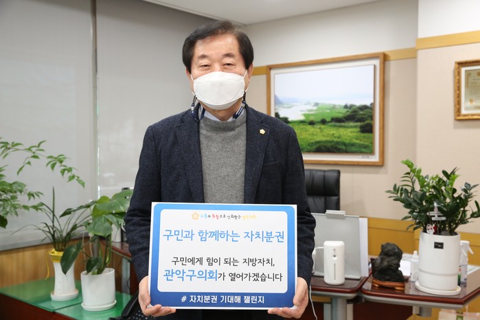 박준희 관악구청장의 지목을 받아 챌린지에 동참한 길 의장은 “이번 지방자치법 개정이 주민자치와 분권을 강화하는 출발점이 될 것이라 믿는다”며 “이런 변화를 맞아 구민과 더욱 가까이에서 민의를 보다 정확히 반영하는 책임있는 의정활동을 펼치며 구민과 자치발전을 위해 앞장서겠다”고 말했다.