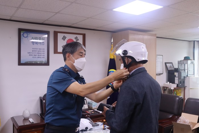 경기 여주경찰서가 1일 북내면행정복지센터를 방문해 이륜자동차를 이동 수단으로 이용하고 있는 농촌지역 노인들을 대상으로 노인 안전모 24개를 전달했다. 기탁식에서 여주경찰서 관계자가 한 노인에게 안전모를 씌워주고 있는 모습. (사진제공=여주시청)