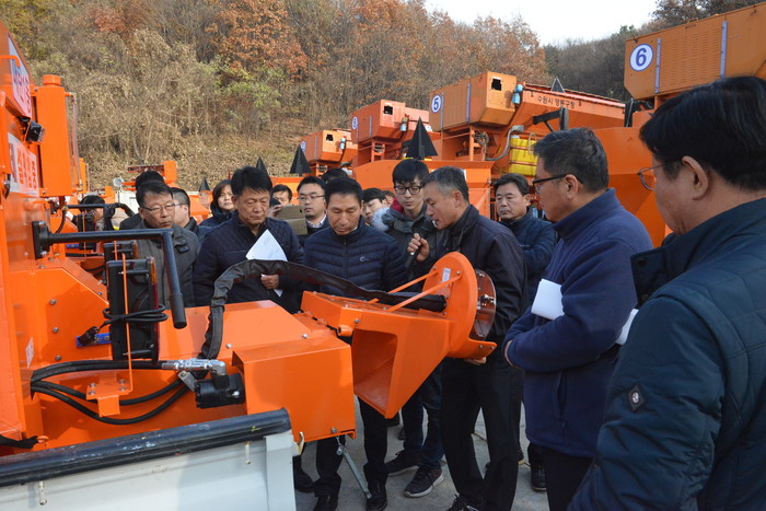 경기 수원시 영통구는 다가오는 겨울철을 대비해 27일 영통구 하동 제설 전진기지에서 구·동 합동으로 폭설대응 제설 종합훈련 및 제설교육을 실시했다. 사진은 제설 장비 가동 훈련 및 시연이 진행 중인 모습. (사진제공=영통구청)