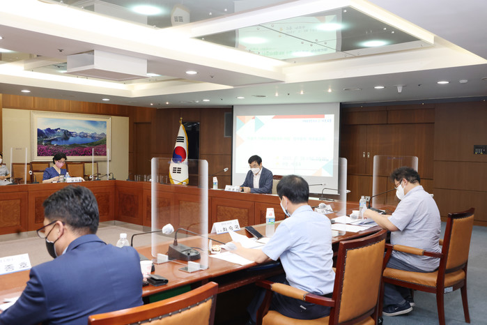 이동진 도봉구청장이 28일 '도봉구 기후변화대응계획 수립 연구용역 착수보고회'에 참석해 용역 수행계획에 대해 보고받고 구의원·도봉구환경정책위원회 등 관계자들과 의견을 나눴다. 사진은 이날 이 구청장(가운데)이 회의를 주재하고 있는 모습. (사진제공=도봉구청)