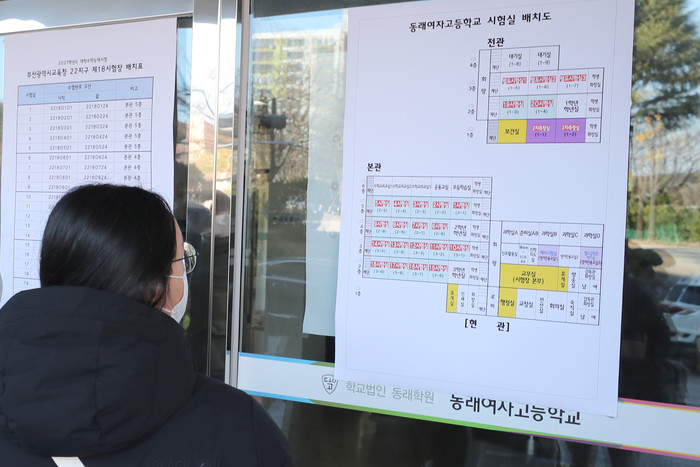 2021학년도 수학능력시험을 하루 앞둔 2일 오전 부산 동래여고에서 수험생이 시험실 배치도를 확인하고 있다.