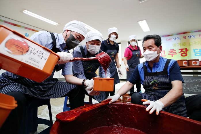 인천 동구 송림1동 주민자치회 '정겨운 송림골 장 담그기 특별위원회'가 최근 6년근 인삼을 넣은 전통 고추장을 담가 지역내 국가유공자·기초생활수급자 등 100가구에 나누는 ‘정겨운 송림골 고추장 담그기’ 행사를 개최했다. 사진은 이날 행사에 참여한 허인환 구청장(왼쪽)이 고추장을 용기에 담고 있는 모습. (사진제공=인천 동구청)
