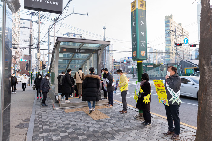 | ▲ 응암역에서 ‘코로나19 방역 강화 및 극복을 위한 캠페인’을 펼치고 있는 의원들의 모습. (사진제공=은평구의회) |