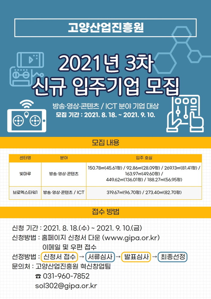[고양=이기홍 기자] 고양산업진흥원(원장 오창희, 이하 진흥원)은 방송·영상·콘텐츠/ICT 등 첨단산업 분야의 기업 육성을 목적으로 기업입주시설 신규 기업을 9월 10일까지 모집한다고 밝혔다.