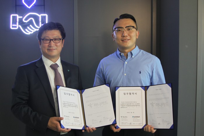 | ▲ 지난 8월26일 위시켓 본사에서 진행된 '금융 비즈니스 모델 구축을 위한 업무 제휴 체결식'에서 한경호 하나카드 글로벌&신성장사업본부장(왼쪽), 박우범 위시켓 대표(오른쪽)이 기념촬영을 하고 있다.(사진제공=하나카드) |