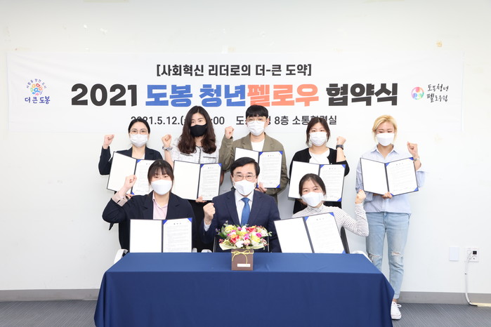 서울 도봉구가 지난 12일 도봉형 청년 사회혁신가인 지역 청년 펠로우 7명과 협약식을 진행했다. 제2기 도봉 청년펠로우는 역사·디자인·미디어리터러시 등 다양한 방면에 종사하는 지역 청년들로 꾸려졌다. 사진은 협약식에서 이동진 구청장(앞줄 가운데)이 청년들과 기념촬영을 하고 있는 모습. (사진제공=도봉구청)